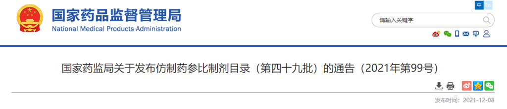 經(jīng)國家藥品監(jiān)督管理局仿制藥質(zhì)量和療效一致性評價(jià)專家委員會審核確定,現(xiàn)發(fā)布仿制藥參比制劑目錄(第四十九批)。