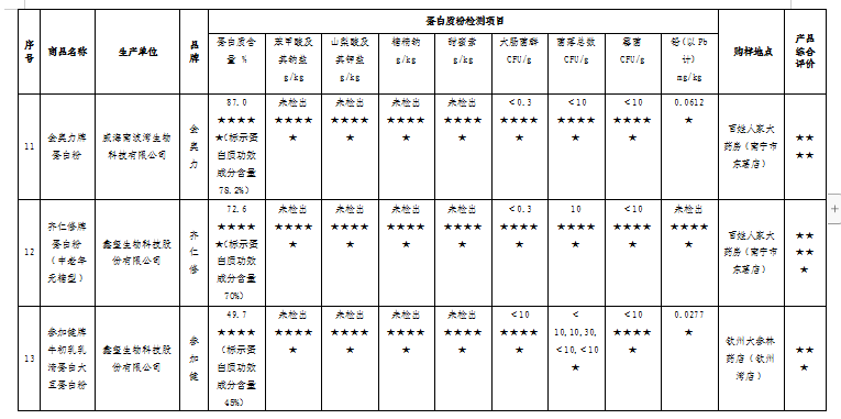 經(jīng)測(cè)試結(jié)果顯示,15款蛋白(質(zhì))粉樣品,其中6款表現(xiàn)優(yōu)秀獲五星,4款表現(xiàn)較好獲四星;4款表現(xiàn)良好獲三星;1款菌落總數(shù)測(cè)試項(xiàng)目不符國家標(biāo)準(zhǔn),不予評(píng)星。測(cè)試結(jié)果僅對(duì)比較試驗(yàn)購買的樣品負(fù)責(zé)。