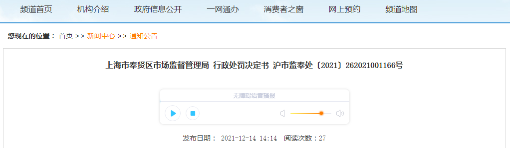 上海市奉賢區(qū)市場(chǎng)監(jiān)督管理局行政處罰決定書