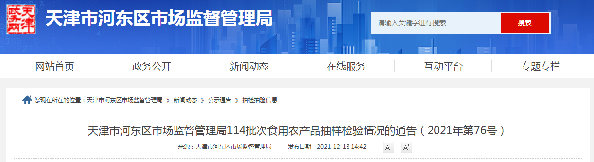 中國質(zhì)量新聞網(wǎng)訊 12月13日,天津市河?xùn)|區(qū)市場監(jiān)督管理局網(wǎng)站發(fā)布114批次食用農(nóng)產(chǎn)品抽樣檢驗情況(2021年第76號)。經(jīng)過檢測,所檢批次樣品受檢項目,107批次合格,7批次不合格。