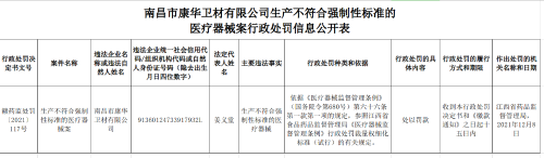 中國質(zhì)量新聞網(wǎng)訊 2021年12月15日,江西省藥監(jiān)局網(wǎng)站發(fā)布醫(yī)療器械行政處罰信息公開(2021年12月15日)。涉及南昌市康華衛(wèi)材有限公司生產(chǎn)不符合強(qiáng)制性標(biāo)準(zhǔn)的醫(yī)療器械案。