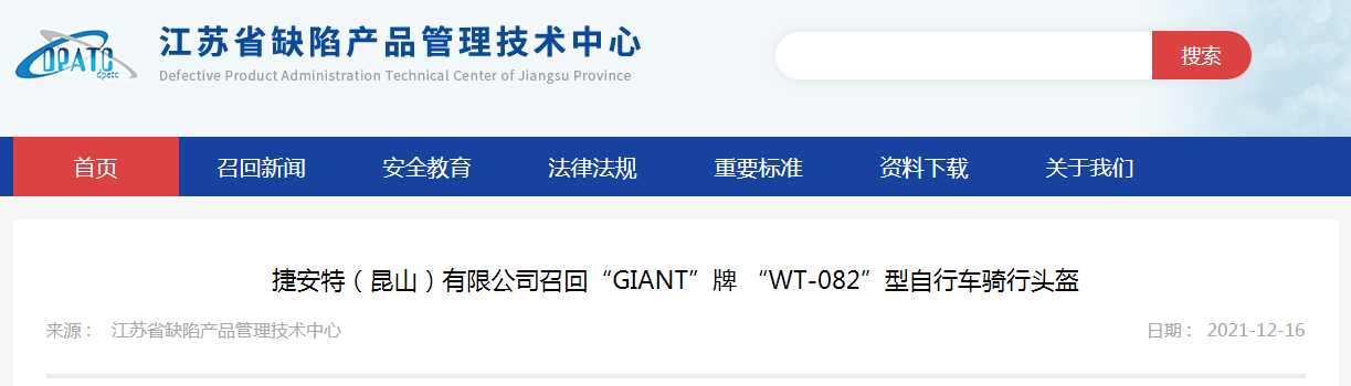 中國質(zhì)量新聞網(wǎng)訊 據(jù)江蘇省缺陷產(chǎn)品管理技術(shù)中心網(wǎng)站12月16日消息,日前,捷安特(昆山)有限公司按照《消費(fèi)品召回管理暫行規(guī)定》的要求,向江蘇省市場監(jiān)督管理局和昆山市市場監(jiān)督管理局報告了召回計劃,將自即日起,召回2020年10月1日至2020年10月31日期間制造的“GIANT”牌“WT-082”型自行車騎行頭盔,涉及數(shù)量為1000件。