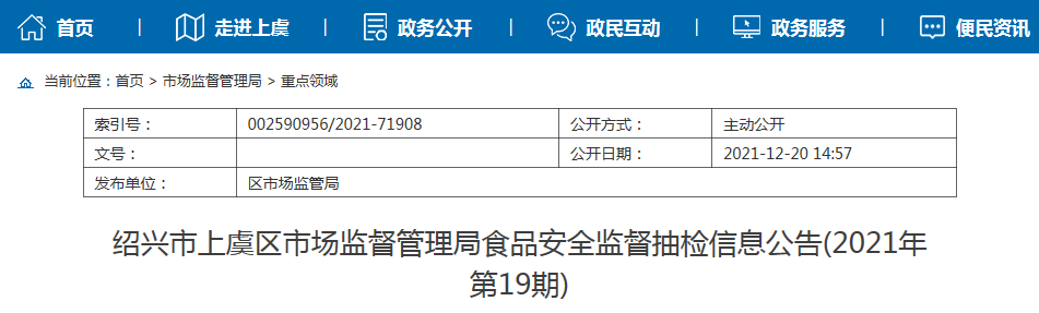中國(guó)質(zhì)量新聞網(wǎng)訊 近日,浙江省紹興市上虞區(qū)市場(chǎng)監(jiān)管局發(fā)布食品安全監(jiān)督抽檢信息(2021年第19期)。