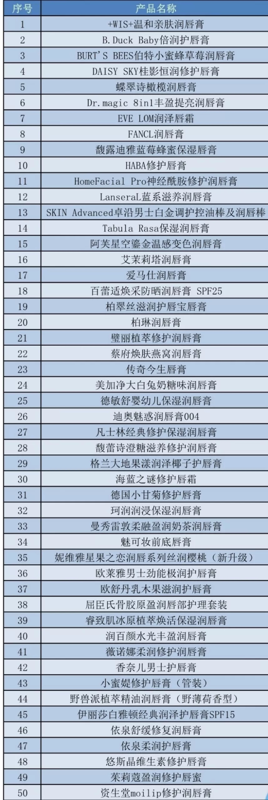 大家一定關(guān)心我們購(gòu)買(mǎi)的50款潤(rùn)唇膏產(chǎn)品有哪些,具體請(qǐng)看下圖