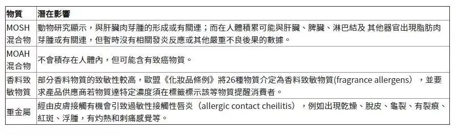 2020年,香港消委會(huì)發(fā)布潤(rùn)唇膏產(chǎn)品檢測(cè)公告,在45款測(cè)試樣本中,有80%樣本檢測(cè)出潛在有害的礦物油物質(zhì),即MOAH(芳香烴礦物油)和MOSH(飽和烴礦物油)。