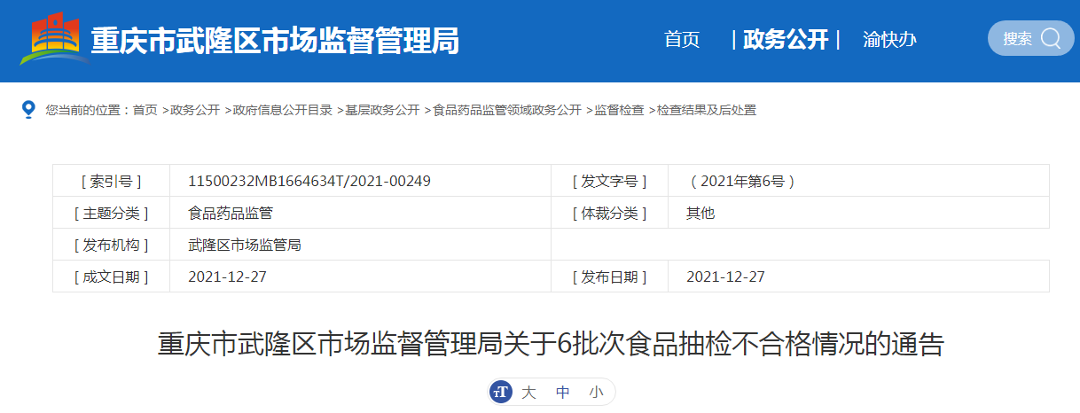 中國質(zhì)量新聞網(wǎng)訊 12月27日,重慶市武隆區(qū)市場監(jiān)督管理局網(wǎng)站發(fā)布關(guān)于6批次食品抽檢不合格情況的通告。通告稱,近期,該局組織食品安全監(jiān)督抽檢,檢出6批次樣品不合格。根據(jù)食品安全國家標(biāo)準(zhǔn),個別項(xiàng)目不合格,其產(chǎn)品判定為不合格產(chǎn)品。