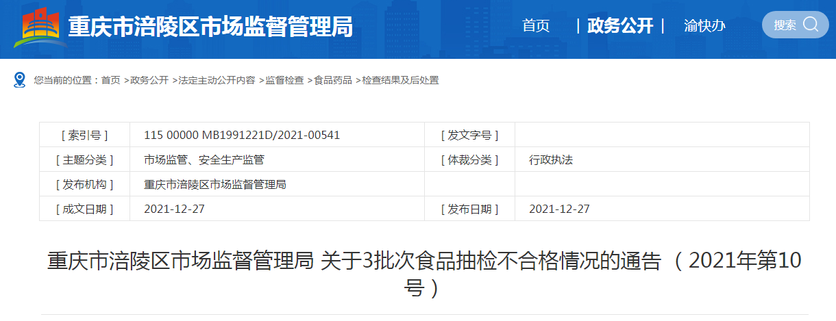中國質(zhì)量新聞網(wǎng)訊 12月27日,重慶市涪陵區(qū)市場監(jiān)督管理局網(wǎng)站發(fā)布關(guān)于3批次食品抽檢不合格情況的通告(2021年第10號)。通告稱,近期,該局組織食品安全監(jiān)督抽檢,檢出3批次樣品不合格。根據(jù)食品安全國家標(biāo)準(zhǔn),個別項目不合格,其產(chǎn)品即判定為不合格產(chǎn)品。