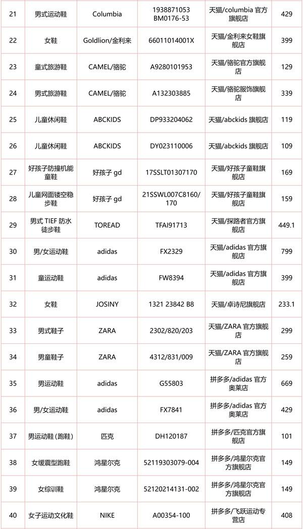 DECATHLON/迪卡儂的運(yùn)動(dòng)休閑鞋、BeLLE/百麗的兒童旅游鞋、NIKKO的登山鞋、FILA的鞋子(未標(biāo)稱產(chǎn)品名稱)、HOBIBEAR的精品童鞋、喬丹的跑步鞋、New Balance的男/女運(yùn)動(dòng)鞋、Clarks的女休閑鞋、Hotwind的女士時(shí)尚休閑鞋、New Balance的兒童運(yùn)動(dòng)鞋、FILA的跑步鞋。