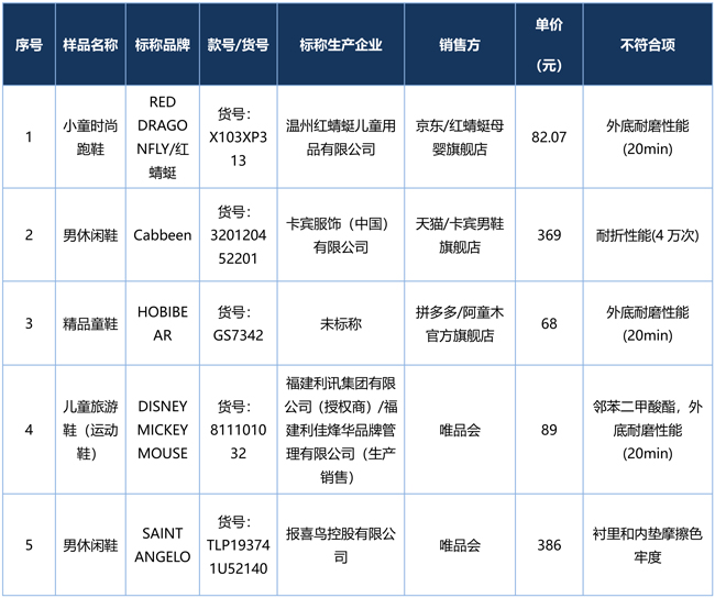 經(jīng)測(cè)試,本次比較試驗(yàn)80款樣品中有16款樣品未達(dá)到測(cè)試標(biāo)準(zhǔn)或比較試驗(yàn)方案的要求。不符合的項(xiàng)目有5項(xiàng),分別是產(chǎn)品標(biāo)識(shí)、成鞋耐折性能、外底耐磨性能、襯里和內(nèi)墊耐摩擦色牢度、鄰苯二甲酸酯,其中產(chǎn)品標(biāo)識(shí)不符合情況最多。