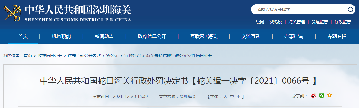 中華人民共和國(guó)蛇口海關(guān)行政處罰決定書(shū)【蛇關(guān)緝一決字〔2021〕0066號(hào)】