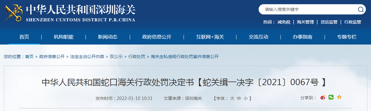 中華人民共和國(guó)蛇口海關(guān)行政處罰決定書【蛇關(guān)緝一決字〔2021〕0067號(hào)】