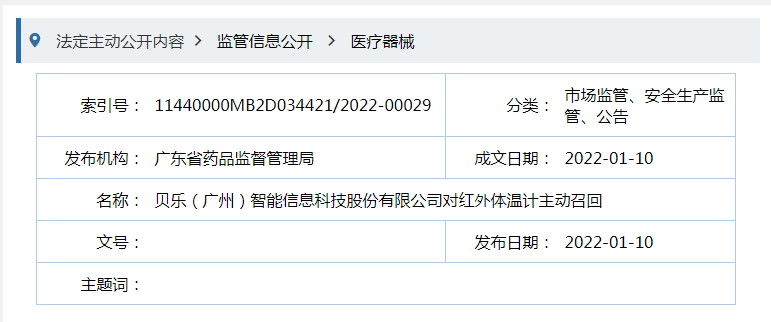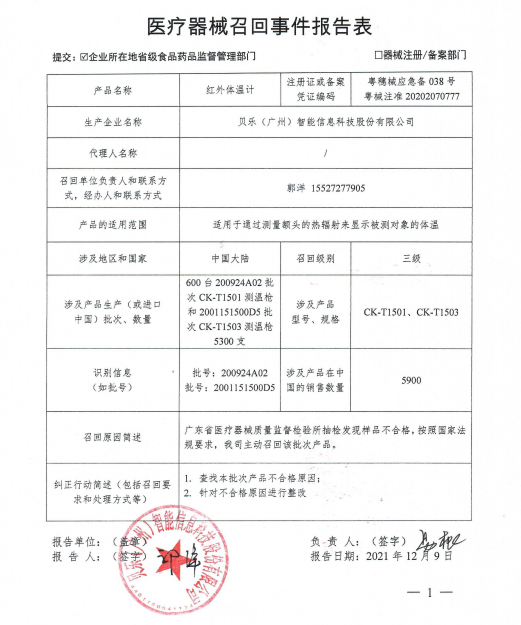 貝樂(廣州)智能信息科技股份有限公司對其生產(chǎn)的紅外體溫計(注冊證號:粵械注準20202070777)生產(chǎn)批號為200924A02、2001151500D5主動召回。召回級別為 三級 。涉及產(chǎn)品的型號、規(guī)格及批次等詳細信息見《醫(yī)療器械召回事件報告表》。