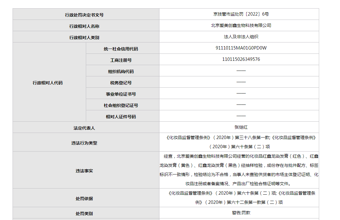據(jù)悉,北京愛美創(chuàng)鑫生物科技有限公司經(jīng)營的化妝品紅鑫龍染發(fā)膏(紅色)、紅鑫龍染發(fā)膏(黃色)、紅鑫龍染發(fā)膏(黑色)經(jīng)抽樣檢驗(yàn),成分存在與批件配方、標(biāo)簽標(biāo)識(shí)不一致情形,檢驗(yàn)結(jié)論為不合格,該公司未查驗(yàn)供貨者的市場主體登記證明、化妝品注冊(cè)或者備案情況、產(chǎn)品出廠檢驗(yàn)合格證明等文件。