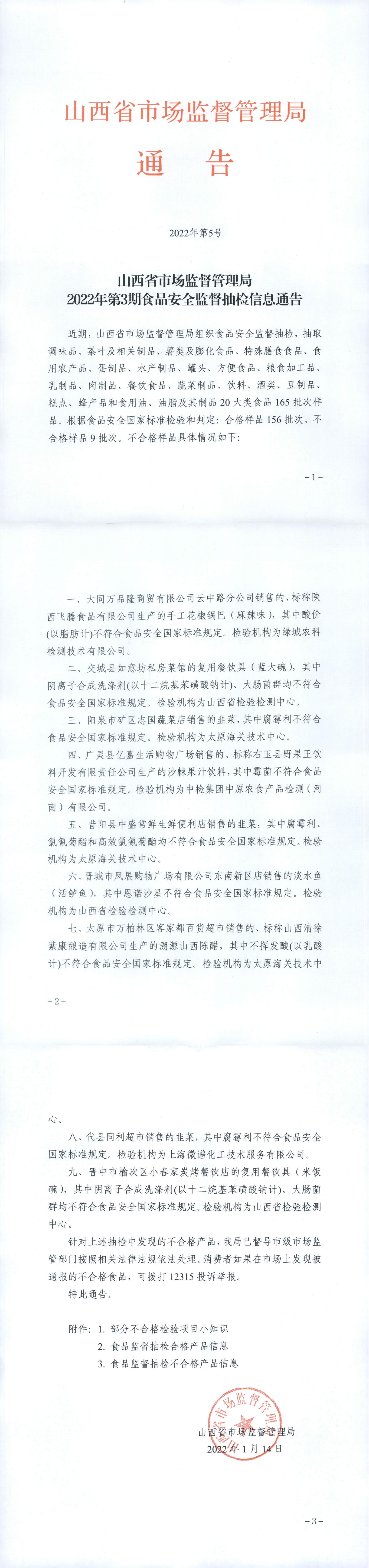 中國(guó)質(zhì)量新聞網(wǎng)訊 近日,山西省市場(chǎng)監(jiān)管局發(fā)布2022年第3期食品安全監(jiān)督抽檢信息通告。本期抽檢20大類食品165批次樣品,合格樣品156批次,不合格樣品9批次。具體信息如下: