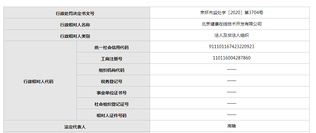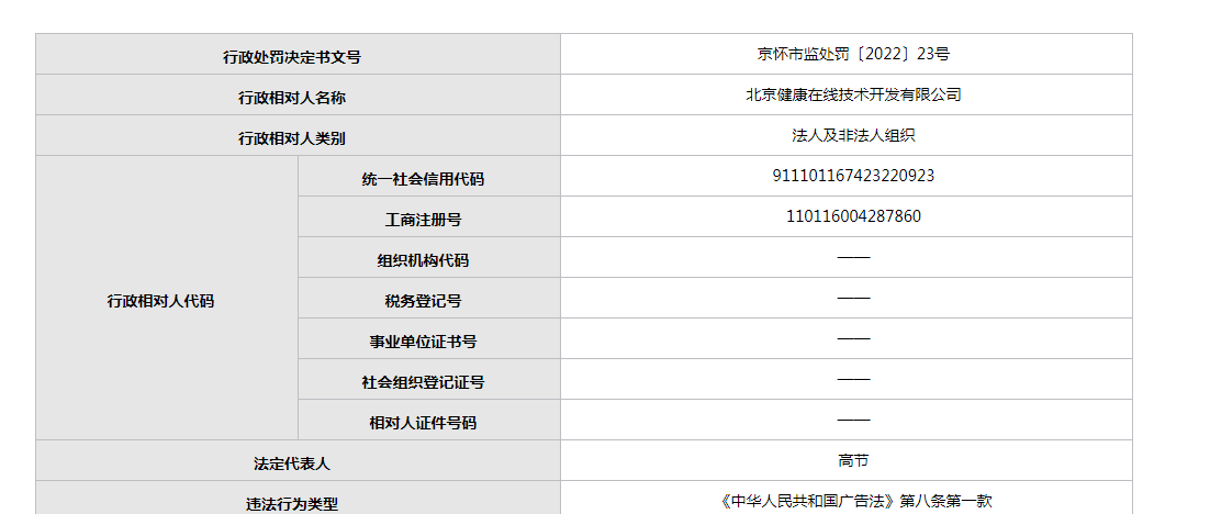 通過(guò)北京市市場(chǎng)監(jiān)管局網(wǎng)站發(fā)現(xiàn),健康在線在2020年就曾因違反廣告法被罰。其宣傳用語(yǔ)為虛假?gòu)V告。
