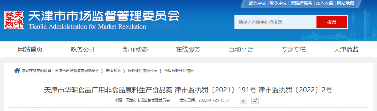 中國質(zhì)量新聞網(wǎng)訊 2022年1月25日,天津市市場監(jiān)督管理委員會網(wǎng)站發(fā)布行政處罰決定書(津市監(jiān)執(zhí)罰〔2021〕191號),涉及天津市華明食品廠。