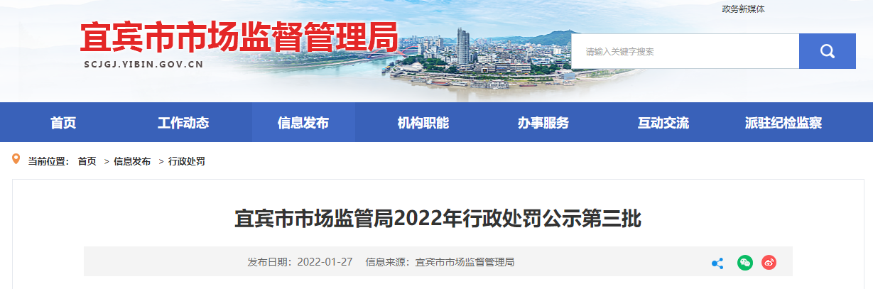 中國質(zhì)量新聞網(wǎng)訊 2022年1月27日,四川省宜賓市市場監(jiān)管局網(wǎng)站公示2022年第三批行政處罰信息。