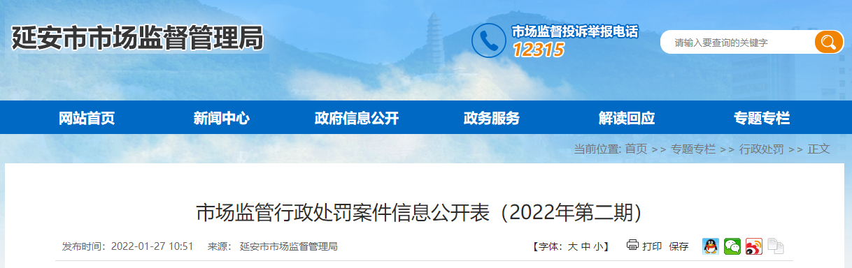中國質(zhì)量新聞網(wǎng)訊 2022年1月27日,陜西省延安市市場監(jiān)督管理局網(wǎng)站公開2022年第二期行政處罰案件信息。