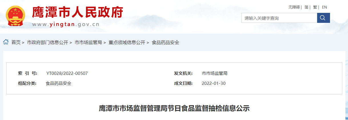 中國質(zhì)量新聞網(wǎng)訊 近日,江西省鷹潭市市場監(jiān)管局公示節(jié)日食品監(jiān)督抽檢信息。本次公布的抽檢信息涉及15大類123批次樣品,全部合格。