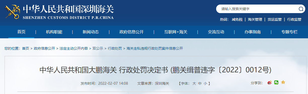 中華人民共和國大鵬海關(guān)行政處罰決定書 (鵬關(guān)緝普違字〔2022〕0012號(hào))