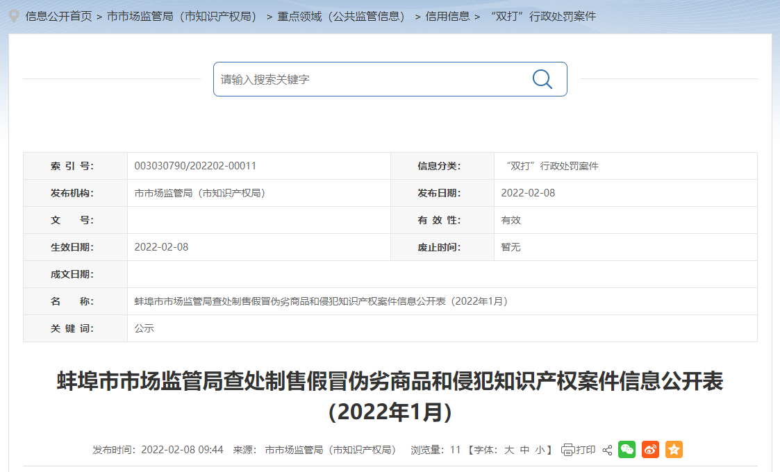 中國(guó)質(zhì)量新聞網(wǎng)訊 近日,安徽省蚌埠市市場(chǎng)監(jiān)管局公開(kāi)查處制售假冒偽劣商品和侵犯知識(shí)產(chǎn)權(quán)案件信息(2022年1月),涉及蚌埠市淮上區(qū)志木百貨商行銷售侵犯注冊(cè)商標(biāo)專用權(quán)的商品案。