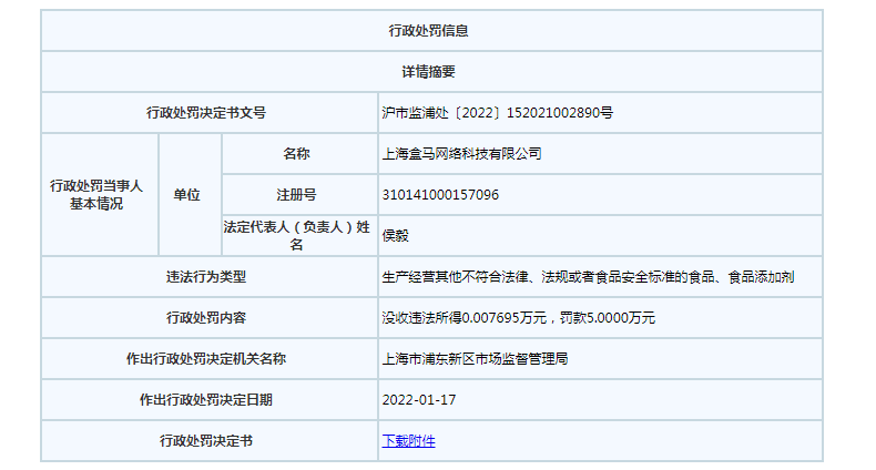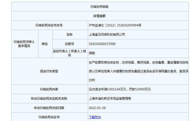 本網(wǎng)注意到,2022年1月17日,上海盒馬網(wǎng)絡(luò)科技有限公司還因銷售不合格牛蛙被罰5萬元。