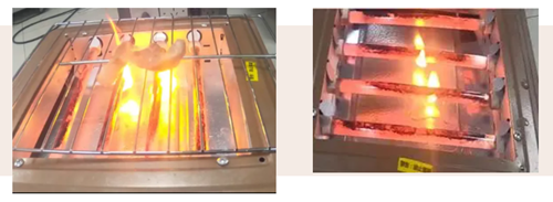 消費(fèi)者在烤肉時(shí)大多會(huì)產(chǎn)生油滴,測試發(fā)現(xiàn),當(dāng)油滴落到石英管上會(huì)出現(xiàn)起火現(xiàn)象,但火焰持續(xù)時(shí)間較短,并未造成對產(chǎn)品結(jié)構(gòu)產(chǎn)生損壞。