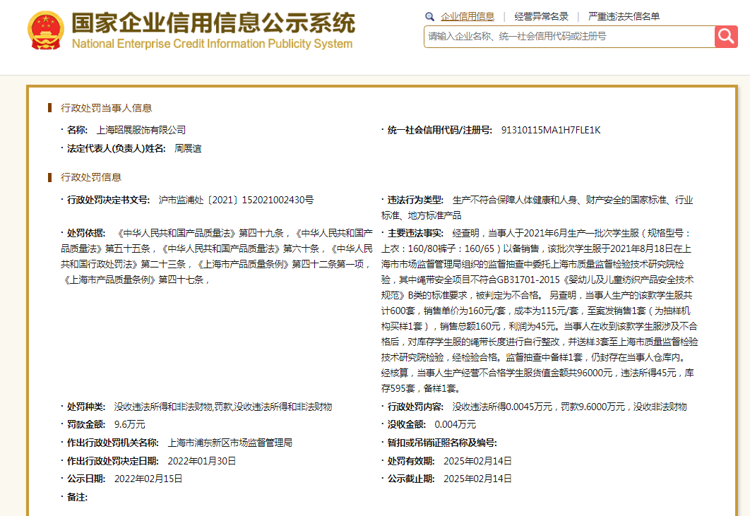 行政處罰決定書(shū)顯示,經(jīng)查明,當(dāng)事人于2021年6月生產(chǎn)一批次學(xué)生服(規(guī)格型號(hào):上衣:160/80褲子:160/65)以備銷售,該批次學(xué)生服于2021年8月18日在上海市市場(chǎng)監(jiān)督管理局組織的監(jiān)督抽查中委托上海市質(zhì)量監(jiān)督檢驗(yàn)技術(shù)研究院檢驗(yàn),其中繩帶安全項(xiàng)目不符合GB31701-2015《嬰幼兒及兒童紡織產(chǎn)品安全技術(shù)規(guī)范》B類的標(biāo)準(zhǔn)要求,被判定為不合格。另查明,當(dāng)事人生產(chǎn)的該款學(xué)生服共計(jì)600套,銷售單價(jià)為160元/套,成本為115元/套,至案發(fā)銷售1套(為抽樣機(jī)構(gòu)買樣1套),銷售總額160元,利潤(rùn)為45元。當(dāng)事人在收到該款學(xué)生服涉及不合格后,對(duì)庫(kù)存學(xué)生服的繩帶長(zhǎng)度自行進(jìn)行整改,并送樣3套至上海市質(zhì)量監(jiān)督檢驗(yàn)技術(shù)研究院檢驗(yàn),經(jīng)檢驗(yàn)合格。監(jiān)督抽查中備樣1套,仍封存在當(dāng)事人倉(cāng)庫(kù)內(nèi)。經(jīng)核算,當(dāng)事人生產(chǎn)經(jīng)營(yíng)不合格學(xué)生服貨值金額共96000元,違法所得45元,庫(kù)存595套,備樣1套。