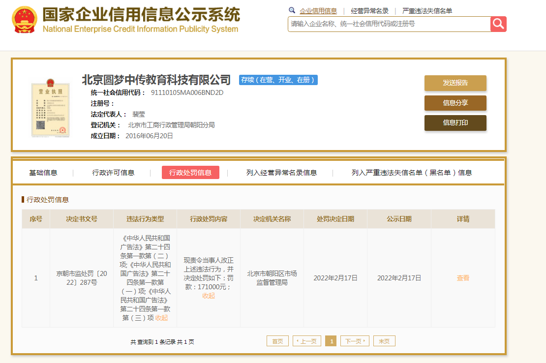 中國質(zhì)量新聞網(wǎng)訊(閆冬)據(jù)國家企業(yè)信用信息公示系統(tǒng)顯示,近日,藝考培訓(xùn)機構(gòu)北京圓夢中傳教育科技有限公司(以下簡稱:圓夢中傳)因違反廣告法被市場監(jiān)管部門罰款17萬余元。