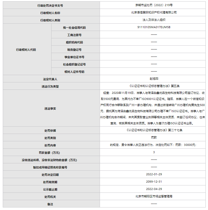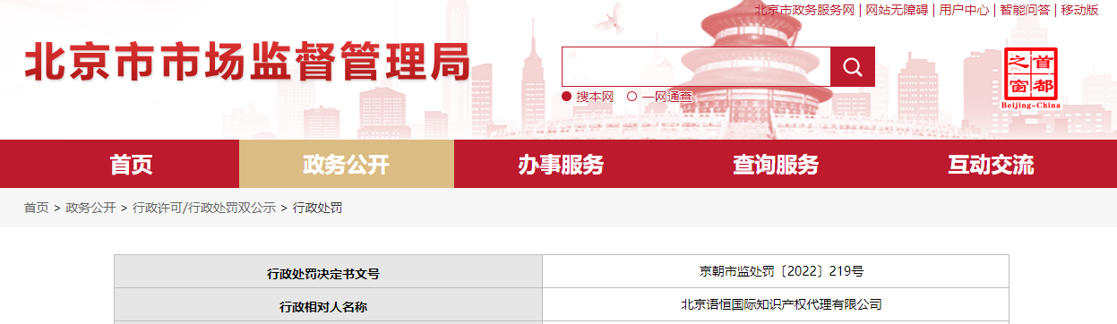 中國(guó)質(zhì)量新聞網(wǎng)訊 日前,北京市朝陽(yáng)區(qū)市場(chǎng)監(jiān)督管理局對(duì)北京語(yǔ)恒國(guó)際知識(shí)產(chǎn)權(quán)代理有限公司作出行政處罰:責(zé)令改正違法行為,罰款30000元。