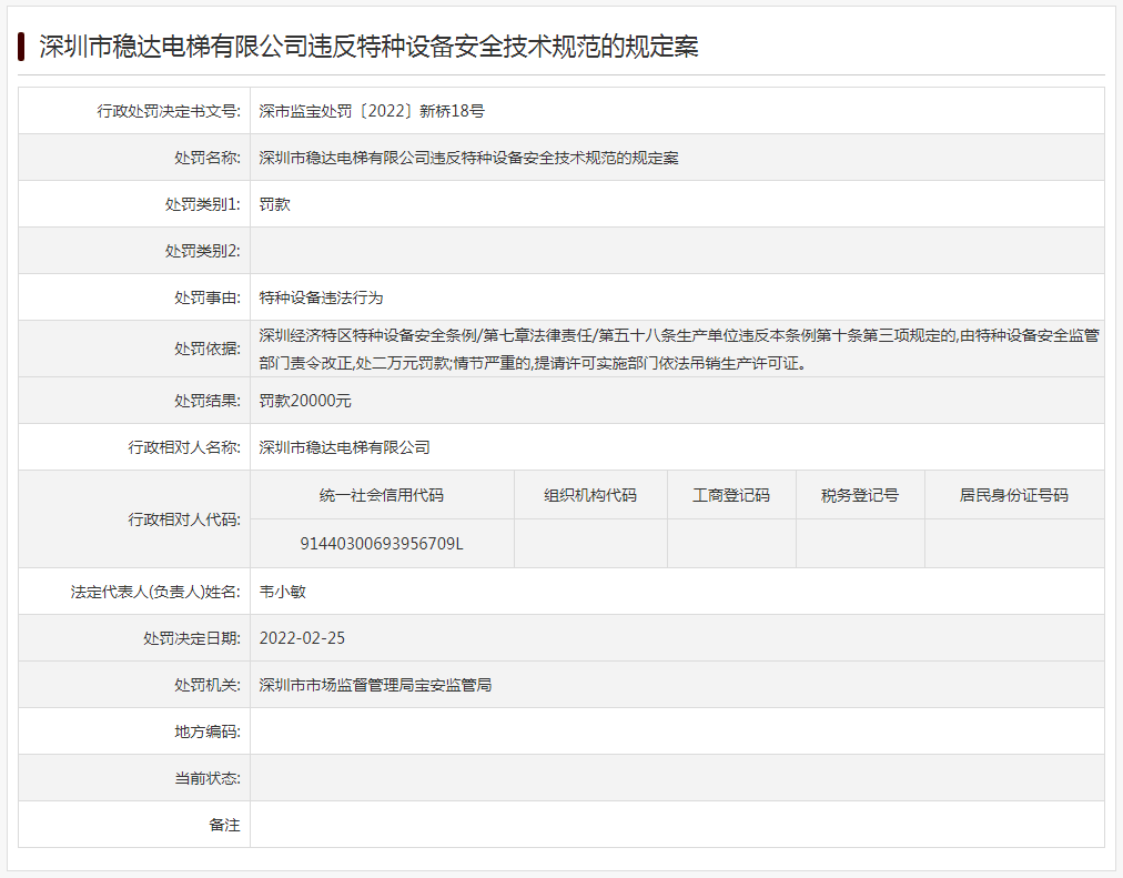 中國質(zhì)量新聞網(wǎng)訊 近日,深圳市市場監(jiān)督管理局寶安監(jiān)管局對深圳市穩(wěn)達電梯有限公司作出行政處罰:罰款20000元,原因是違反特種設(shè)備安全技術(shù)規(guī)范的規(guī)定。