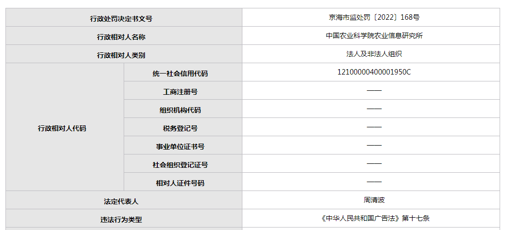行政處罰決定書顯示,經(jīng)查,《農(nóng)業(yè)科技通訊》2021年8月刊中,于封面起第3頁(yè)刊登了“愛(ài)民藍(lán)麥1號(hào)”審定編號(hào)為魯審麥20206036的小麥廣告。廣告寫有“藍(lán)小麥之所以呈藍(lán)色,是因?yàn)檫@種小麥籽粒中含有大量的花青素,花青素是一種強(qiáng)有力的抗氧化劑,能夠保護(hù)人體免受‘自由基’有害物質(zhì)的損傷。具有保護(hù)中樞神經(jīng)系統(tǒng)、增大血管彈性、降低血壓;清除小血栓,改善循環(huán)系統(tǒng),預(yù)防動(dòng)脈粥樣硬化,減少心臟病和中風(fēng)發(fā)生概率;抑制炎癥和抗過(guò)敏;增加關(guān)節(jié)的柔韌性等保健作用”。又查,該小麥屬于食品范疇。