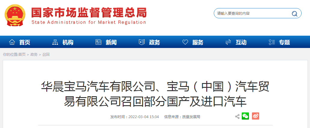 中國質(zhì)量新聞網(wǎng)訊 據(jù)市場監(jiān)管總局網(wǎng)站3月4日消息,日前,華晨寶馬汽車有限公司、寶馬(中國)汽車貿(mào)易有限公司根據(jù)《缺陷汽車產(chǎn)品召回管理條例》和《缺陷汽車產(chǎn)品召回管理條例實施辦法》的要求,向國家市場監(jiān)督管理總局備案了召回計劃,自即日起召回以下車輛。
