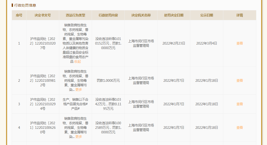 中國(guó)質(zhì)量新聞網(wǎng)訊(閆冬)日前,上海市市場(chǎng)監(jiān)管局發(fā)布一則行政處罰信息。上海七寶樂購(gòu)購(gòu)物中心有限公司(以下簡(jiǎn)稱:當(dāng)事人)因所售食品不合格被罰款。本網(wǎng)發(fā)現(xiàn),2022年剛過(guò)兩個(gè)月,該公司已經(jīng)4次被市場(chǎng)監(jiān)管部門處罰。