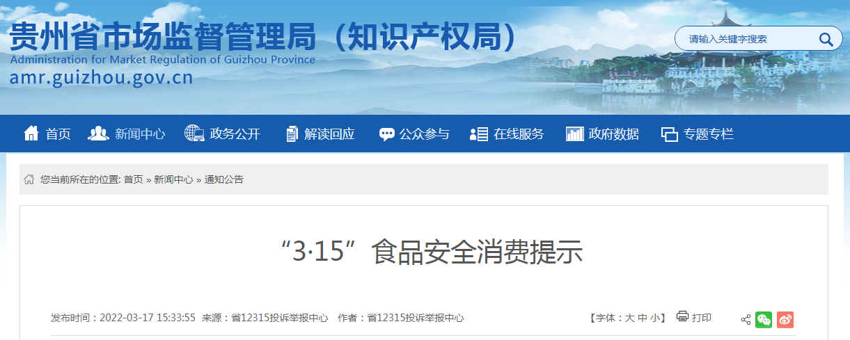 2022年“3·15”國際消費(fèi)者權(quán)益日到來之際,貴州省12315投訴舉報(bào)中心提醒廣大消費(fèi)者注意食品安全。
