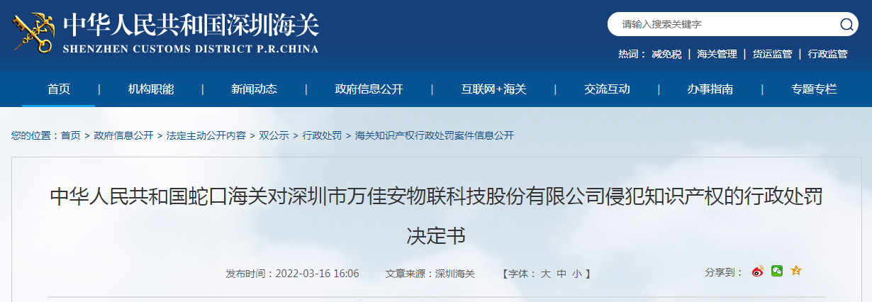 中華人民共和國蛇口海關(guān)對深圳市萬佳安物聯(lián)科技股份有限公司侵犯知識產(chǎn)權(quán)的行政處罰決定書