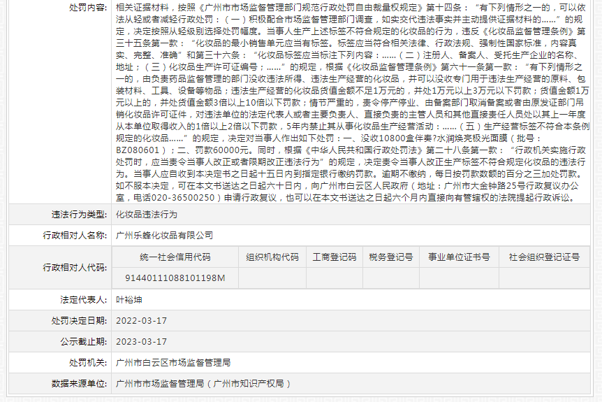 中國質(zhì)量新聞網(wǎng)訊 近日,廣州市白云區(qū)市場(chǎng)監(jiān)管局發(fā)布的行政處罰顯示,存在化妝品違法行為,廣州樂蜂化妝品有限公司被罰款60000元。
