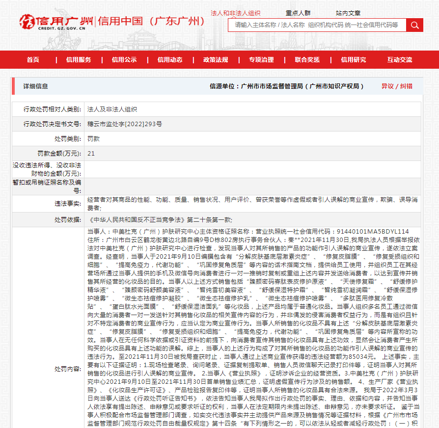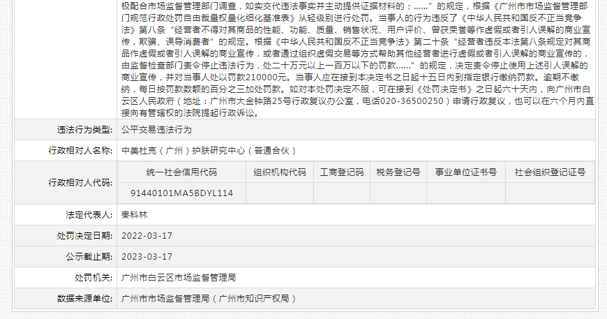 中國質(zhì)量新聞網(wǎng)訊 近日,廣州市白云區(qū)市場監(jiān)督管理局對中美杜克(廣州)護(hù)膚研究中心(普通合伙)作出行政處罰:責(zé)令停止使用引人誤解的商業(yè)宣傳;罰款210000元。