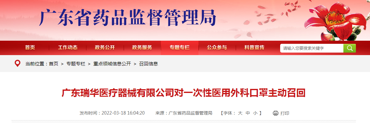 中國(guó)質(zhì)量新聞網(wǎng)訊 據(jù)廣東省藥品監(jiān)督管理局網(wǎng)站3月18日消息,廣東瑞華醫(yī)療器械有限公司生產(chǎn)的一次性醫(yī)用外科口罩,生產(chǎn)批號(hào)為20201206,經(jīng)抽檢發(fā)現(xiàn)不符合標(biāo)準(zhǔn)規(guī)定,廣東瑞華醫(yī)療器械有限公司決定發(fā)起主動(dòng)召回。