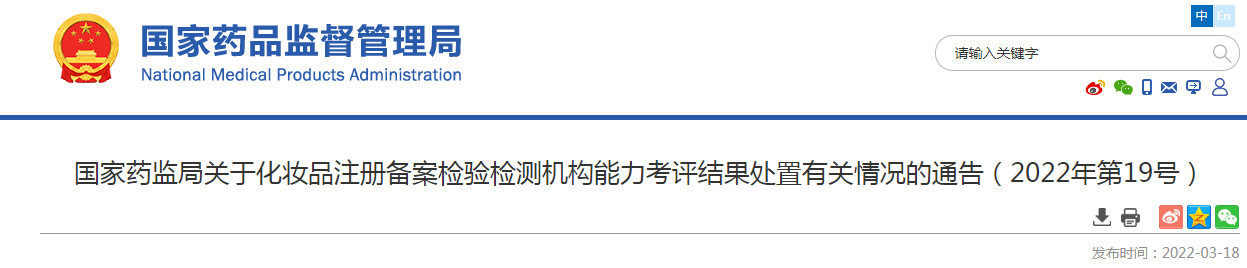 國家藥監(jiān)局關(guān)于化妝品注冊備案檢驗(yàn)檢測機(jī)構(gòu)能力考評結(jié)果處置有關(guān)情況的通告(2022年第19號)
