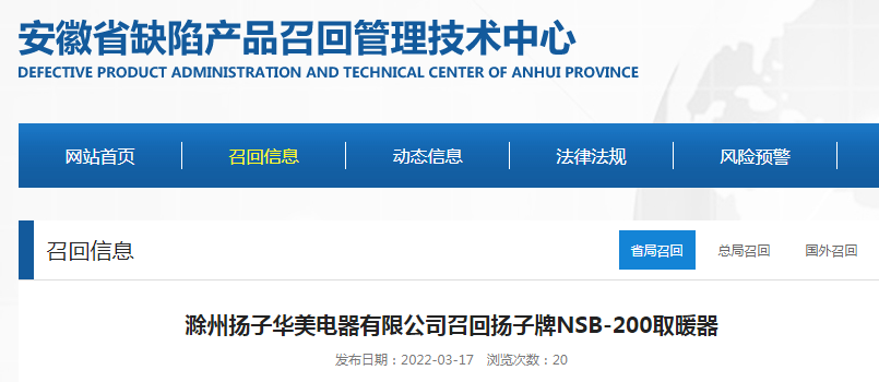 中國(guó)質(zhì)量新聞網(wǎng)訊 據(jù)安徽省缺陷產(chǎn)品召回管理技術(shù)中心網(wǎng)站消息,日前,滁州揚(yáng)子華美電器有限公司按照《消費(fèi)品召回管理暫行規(guī)定》的要求,向安徽省市場(chǎng)監(jiān)督管理局、滁州市市場(chǎng)監(jiān)督管理局報(bào)告了召回計(jì)劃,將自即日起,召回2021年9月28日至2021年9月30日期間制造的揚(yáng)子牌NSB-200型號(hào)取暖器,涉及數(shù)量為110臺(tái)。