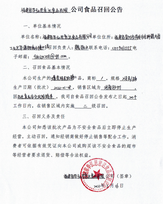 中國(guó)質(zhì)量新聞網(wǎng)訊 據(jù)福建省市場(chǎng)監(jiān)管局網(wǎng)站3月18日消息,福建省華弘思意達(dá)食品有限公司發(fā)布食品召回公告,召回部分爆漿陳皮軟糖產(chǎn)品。