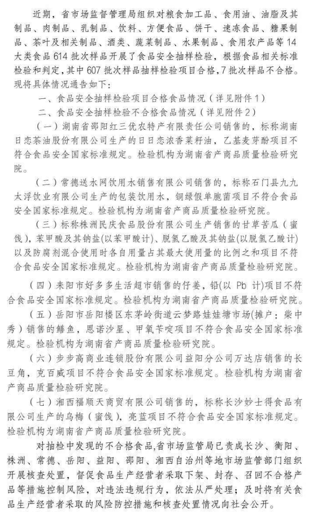 中國(guó)質(zhì)量新聞網(wǎng)訊 2022年3月25日,湖南省市場(chǎng)監(jiān)督管理局發(fā)布關(guān)于614批次食品安全抽樣檢驗(yàn)情況的通告(2022年第1期)。