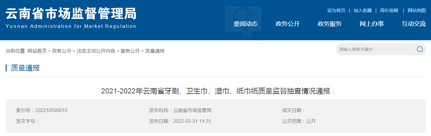 中國質(zhì)量新聞網(wǎng)訊 3月31日,云南省市場監(jiān)管局網(wǎng)站通報2021-2022年云南省牙刷、衛(wèi)生巾、濕巾、紙巾紙質(zhì)量監(jiān)督抽查情況。為進一步加強對牙刷、衛(wèi)生巾、濕巾、紙巾紙產(chǎn)品質(zhì)量安全監(jiān)管,2021年7月至2022年1月,云南省市場監(jiān)督管理局在全省范圍內(nèi)開展了牙刷、衛(wèi)生巾、濕巾、紙巾紙產(chǎn)品質(zhì)量監(jiān)督抽查?,F(xiàn)將主要情況通報如下: