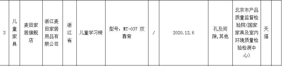 抽查情況顯示,標(biāo)稱浙江麥田家居用品有限公司生產(chǎn)的兒童學(xué)習(xí)椅(型號:MT-037 雙靠背),生產(chǎn)日期/批號:2020.12.6,主要不合格項(xiàng)目為孔及間隙,其他。標(biāo)稱受檢店鋪為麥田家居旗艦店。電商平臺為天貓。承檢機(jī)構(gòu)為北京市產(chǎn)品質(zhì)量監(jiān)督檢驗(yàn)院(國家家具及室內(nèi)環(huán)境質(zhì)量檢驗(yàn)檢測中心)。