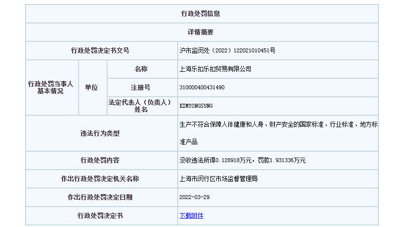 依據(jù)相關(guān)規(guī)定,上海市閔行區(qū)市場監(jiān)督管理局對上海樂扣樂扣罰款19313.36元,沒收違法所得1289.18元,并責令停止銷售不合格產(chǎn)品。