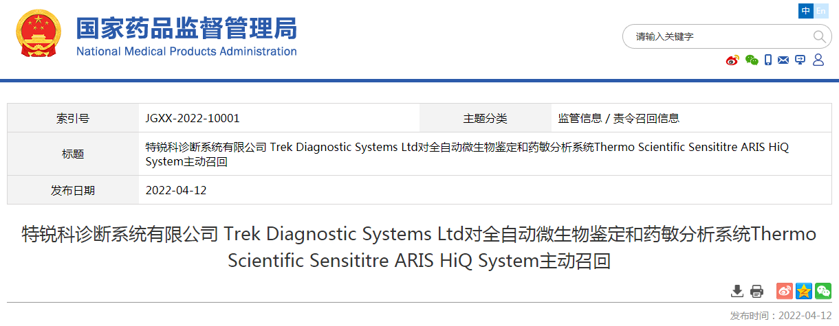 賽默飛世爾科技(中國)有限公司報(bào)告,由于涉及特定型號、特定批次產(chǎn)品,存在HiQ V4000儀器的機(jī)械手驅(qū)動板缺失2個電容的問題,生產(chǎn)商特銳科診斷系統(tǒng)有限公司 Trek Diagnostic Systems Ltd對全自動微生物鑒定和藥敏分析系統(tǒng)Thermo Scientific Sensititre ARIS HiQ System(注冊證編號:國械注進(jìn)20222200041)主動召回。召回級別為三級。涉及產(chǎn)品的型號、規(guī)格及批次等詳細(xì)信息見《醫(yī)療器械召回事件報(bào)告表》。