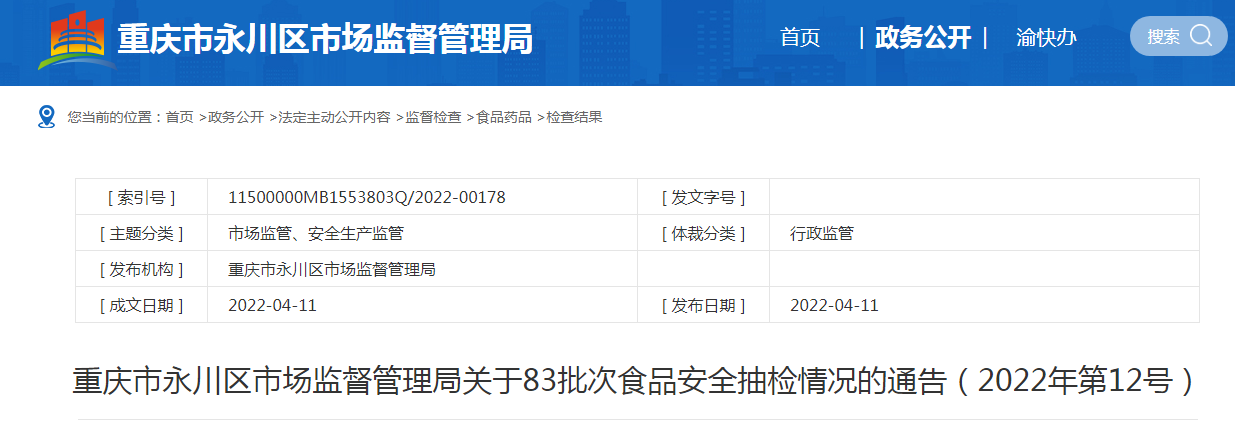 中國質(zhì)量新聞網(wǎng)訊 近日,重慶市永川區(qū)市場監(jiān)督管理局發(fā)布關(guān)于83批次食品安全抽檢情況的通告(2022年第12號(hào))。通告稱,近期,該局組織抽檢食用農(nóng)產(chǎn)品83批次樣品。抽樣檢驗(yàn)項(xiàng)目合格樣品81批次,不合格樣品2批次。根據(jù)食品安全國家標(biāo)準(zhǔn),個(gè)別項(xiàng)目不合格,其產(chǎn)品即判定為不合格產(chǎn)品。