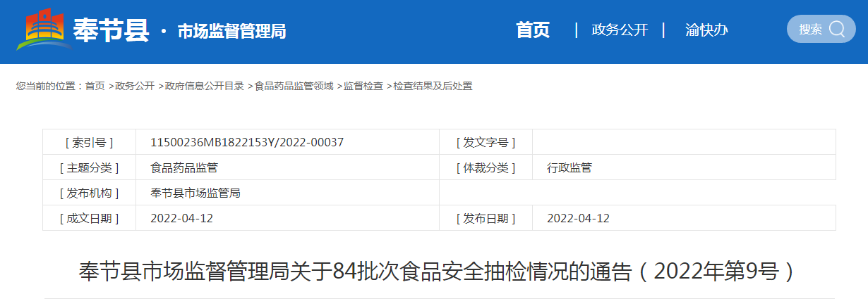中國質量新聞網(wǎng)訊 4月12日,重慶市奉節(jié)縣市場監(jiān)督管理局網(wǎng)站發(fā)布關于84批次食品安全抽檢情況的通告(2022年第9號)。通告稱,近期,該局組織抽檢餐飲食品、食用農(nóng)產(chǎn)品、調味品、糧食加工品、飲料、酒類、肉制品、豆制品、淀粉及淀粉制品、水果制品等22類食品84批次樣品。抽樣檢驗項目合格樣品82批次,不合格樣品2批次。根據(jù)食品安全國家標準,個別項目不合格,其產(chǎn)品即判定為不合格產(chǎn)品。