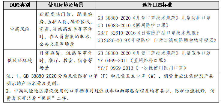 兒童口罩的產(chǎn)品名稱并不能讓消費者對產(chǎn)品類型進行直接有效的區(qū)分,應(yīng)重點查看口罩包裝上所注明的產(chǎn)品標準,在對應(yīng)的使用場景下選擇滿足標準技術(shù)指標要求的口罩: